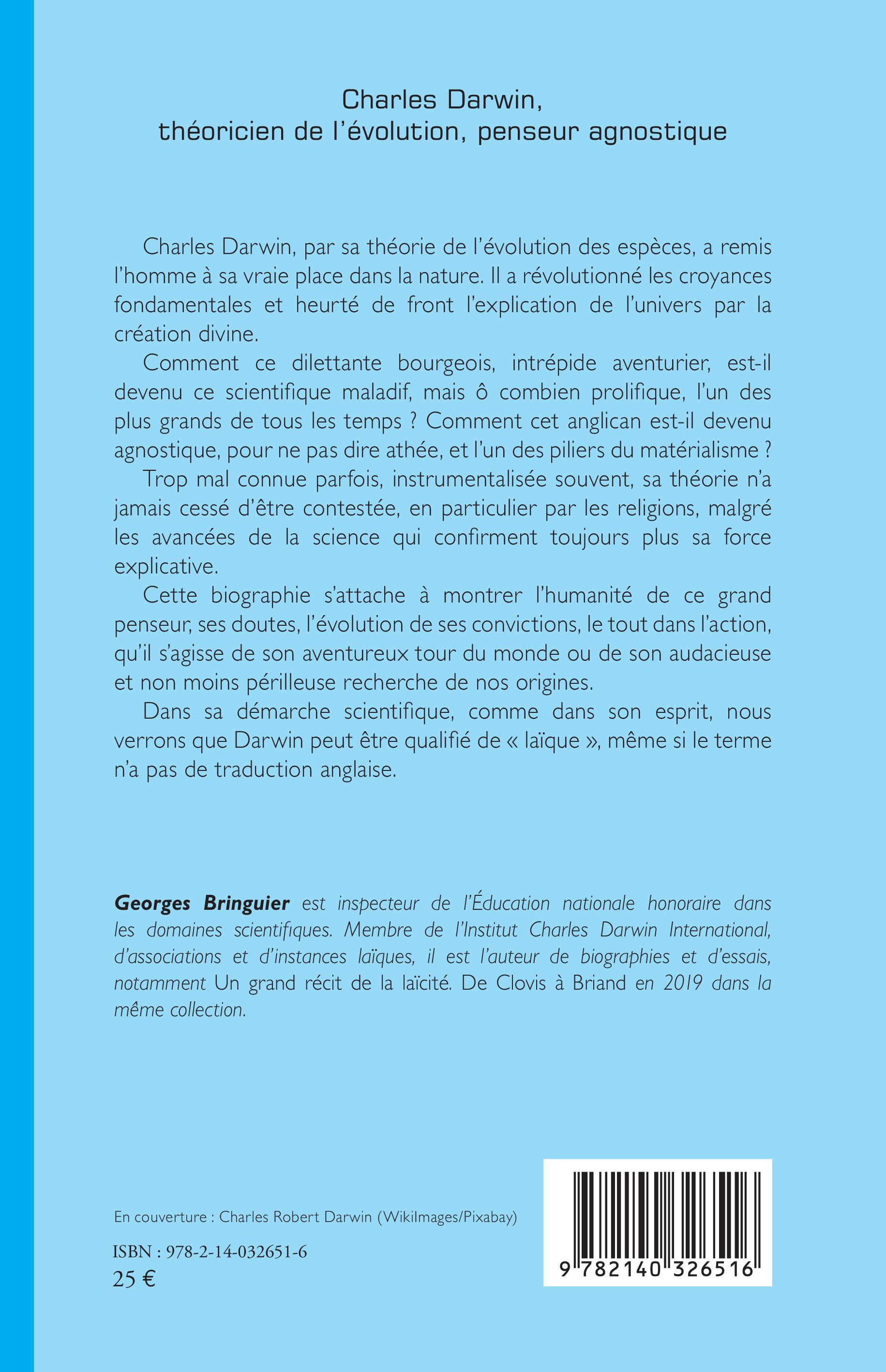 Parution aux éditions L'Harmattan du livre de Georges Bringuier Charles Darwin, théoricien de l'évolution, penseur agnostique.